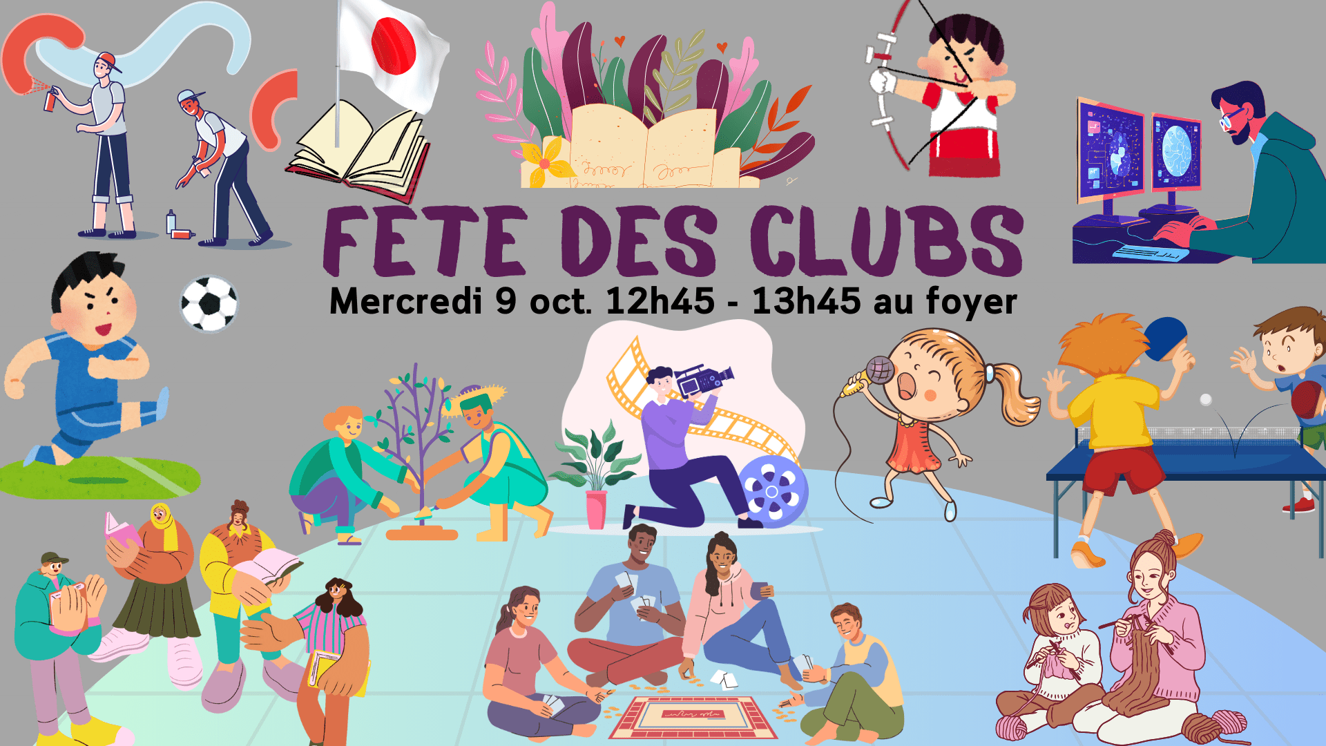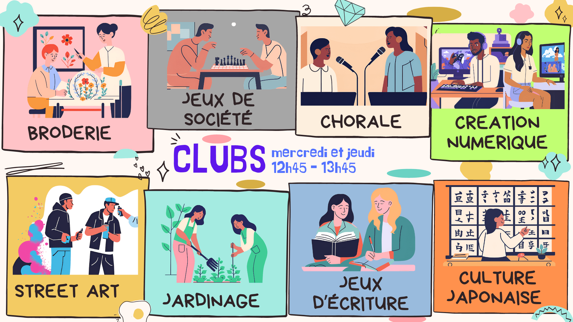 Le Mercredi 9 octobre 2024, l’ensemble des clubs et ateliers ont été proposés aux élèves. Ils se dérouleront les mercredis et jeudis entre 12h45 et 13h45.